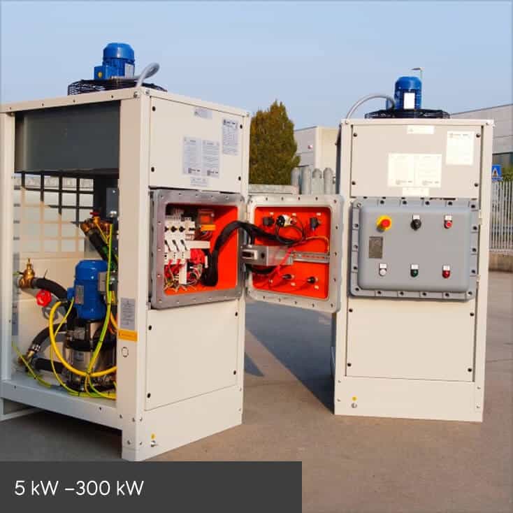 - Koeling: ATEX-gecertificeerde chillers en koelaggregaten (lucht- en watergekoeld) met vermogens tot 800 kW, voor proceskoeling of comforttoepassingen.